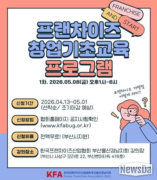 뉴스다 최광묵 기자 | 부산시는 지역 프랜차이즈 산업의 성장을 지원하기 위해 프랜차이즈 가맹점 창업을 희망하는 예비 창업자를 대상으로 '프랜차이즈 창업 기초 교육' 프로그램을 운영한다고 밝혔다.