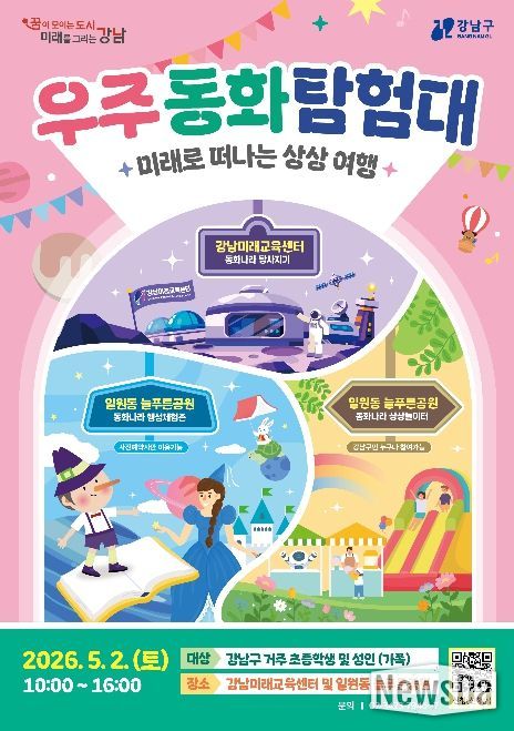 뉴스다 최광묵 기자 | 꿈이 모이는 도시, 미래를 그리는 강남구가 어린이날을 맞아 5월 2일 오전 10시부터 오후 4시까지 일원동 늘푸른공원과 강남미래교육센터에서 어린이날 행사 ‘우주 동화 탐험대: 미래로 떠나는 상상 여행’을 개최한다. 동화와 우주, 인공지능(AI)·로봇·드론을 결합한 체험형 프로그램으로, 아이들이 놀이하듯 미래기술을 접할 수 있도록 구성했다.
