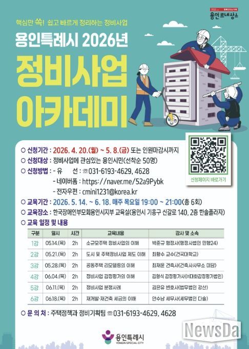 뉴스다 최광묵 기자 | 용인특례시는 4월 20일부터 5월 8일까지 ‘2026년 정비사업 아카데미’ 수강생을 모집한다.