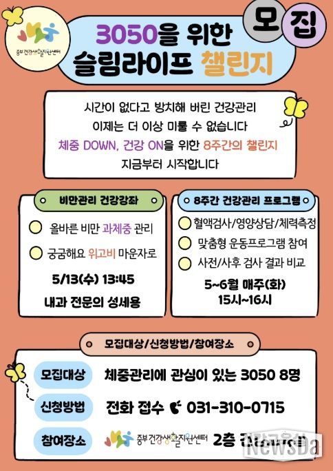 뉴스다 최광묵 기자 | 시흥시 중부건강생활지원센터는 비만 위험 요인이 있는 30~50대 성인을 대상으로 건강한 생활 습관 형성과 만성질환 예방을 위한 ‘슬림라이프 챌린지’를 운영하며 참여자를 모집한다.