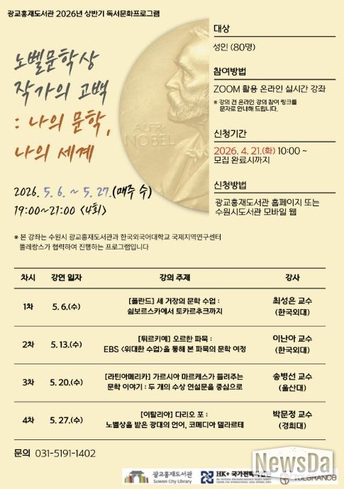 뉴스다 최광묵 기자 | 수원시 광교홍재도서관이 한국외국어대학교와 협력해 진행하는 2026년 세계문화기행 시리즈 1편 ‘노벨문학상 작가의 고백 : 나의 문학, 나의 세계’ 강좌를 수강할 시민을 모집한다.
