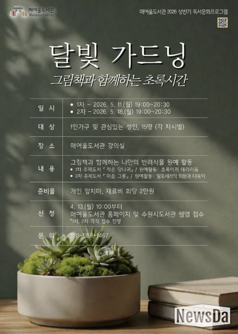 뉴스다 최광묵 기자 | 수원시 매여울도서관이 그림책 읽기와 식물 가드닝을 결합한 체험형 프로그램 ‘달빛 가드닝, 그림책과 함께하는 초록시간’을 운영한다.