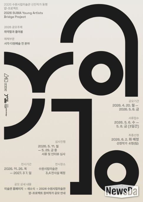뉴스다 최광묵 기자 | 경기도 수원시립미술관은 신진작가 발굴 및 창작 지원을 위한 공모 사업‘신진작가 동행 얍-프로젝트(YAB-Project)’를 개최하고 4월 20일부터 5월 8일까지 참여자 모집 공고를 시작한다. 서류 접수는 5월 6일부터 5월 8일 오후 6시까지 이메일을 통해 진행된다.