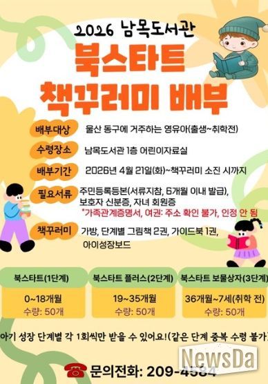 뉴스다 최광묵 기자 | 울산 동구 남목도서관은 4월 21일부터 동구 관내에 거주하는 영유아를 대상으로 책 꾸러미를 선물하는 ‘2026 북스타트 사업’을 추진한다.