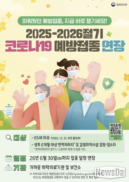 이번 연장 대상은 2025-2026절기 코로나19 미접종자와 기접종자 중 면역저하자다. 특히 면역저하자는 일반인보다 면역 유지 기간이 상대적으로 짧은 점을 고려해 최소 접종 간격 90일을 준수하면 연장 기간인 5월 1일부터 6월 30일까지 1회 추가접종이 가능하다.
