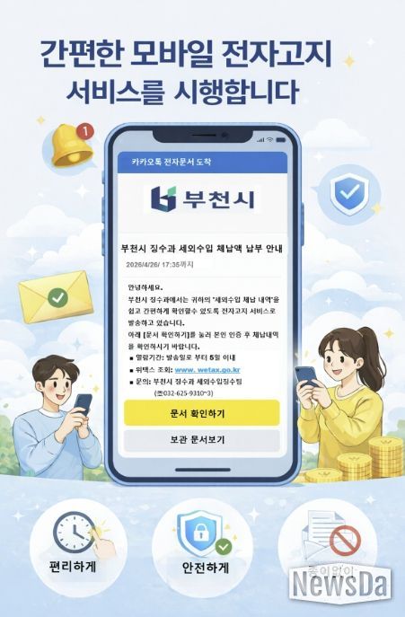 뉴스다 최광묵 기자 | 부천시는 이달 20일부터 시민 납세 편의를 높이고 고지서 전달의 정확성을 강화하기 위해 세외수입(일반회계) 체납안내문을 카카오톡으로 발송하는 모바일 전자고지 서비스를 시행한다.