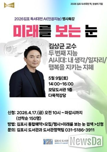 뉴스다 최광묵 기자 | 2026 김포 독서대전 ' 미래를 보는 눈: AI(인공지능) ' 명사 특강으로 김상균 교수의 강연이 오는 5월 9일 토요일 낮 2시 모담도서관에서 열린다.