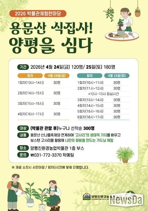 뉴스다 최광묵 기자 | 양평친환경농업박물관은 오는 4월 24일부터 25일까지 이틀간 2026년 ‘박물관체험한마당’ 체험 프로그램을 운영한다.