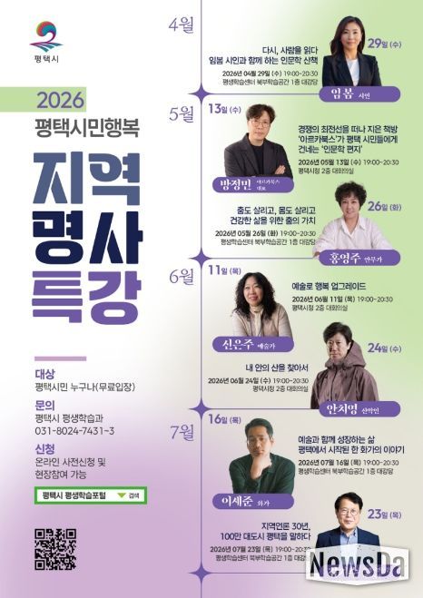 한편 모든 강좌는 4월 20일부터 평택시 평생학습 포털 및 전화로 사전 신청할 수 있으며, 일부 잔여 좌석에 한해 현장 참여도 가능하다. 평택시는 이번 지역 명사 특강을 통해 시민의 지식 성장을 지원하고, 열린 평생학습 문화 조성을 더욱 강화할 계획이다.