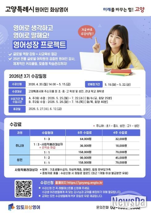 뉴스다 최광묵 기자 | 고양특례시는 글로벌 역량 강화와 사교육비 부담 완화를 위한 ‘원어민 화상영어’ 프로그램의 3기 수강생을 4월 20일부터 5월 15일까지 모집한다.