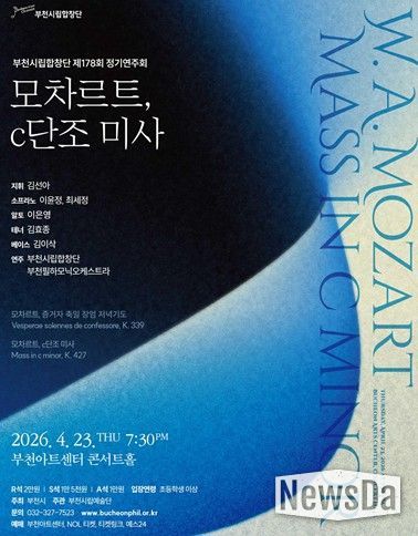 뉴스다 최광묵 기자 | 부천시립합창단이 오는 4월 23일 오후 7시 30분 부천아트센터 콘서트홀에서 제178회 정기연주회 ‘모차르트, c단조 미사’를 개최한다. 이번 공연은 김선아 상임지휘자의 지휘 아래 소프라노 이윤정, 최세정, 알토 이은영, 테너 김효종, 베이스 김이삭이 협연자로 무대에 오르며, 부천시립합창단과 부천필하모닉오케스트라, 구민아(오르간)가 함께한다.