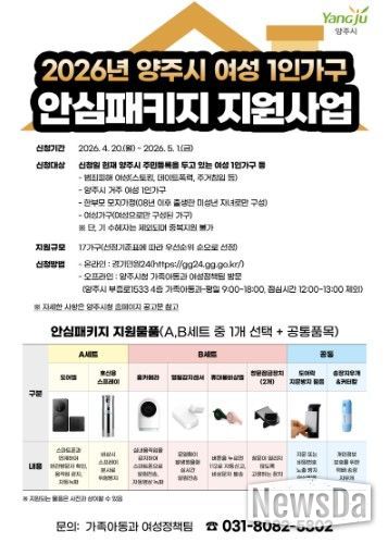 뉴스다 최광묵 기자 | 양주시는 관내 여성 1인 가구 등 범죄 취약 여성 가구의 안전한 일상을 지원하기 위해 ‘2026년 양주시 여성 1인 가구 안심패키지 지원사업’을 추진한다.