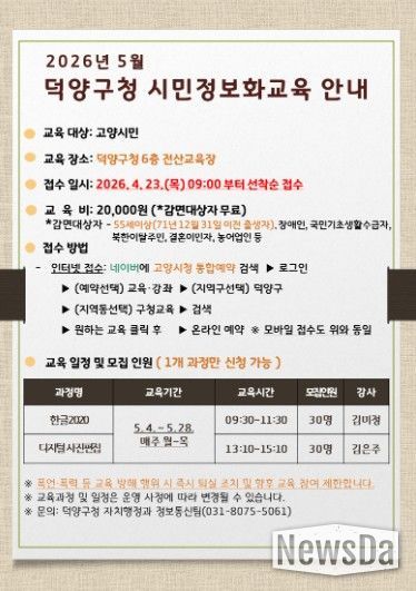 교육은 5월 4일부터 28일까지 덕양구청 전산교육장에서 진행되며, 수강 신청은 4월 23일 오전 9시부터 덕양구청 통합예약 누리집을 통해 온라인으로 접수할 수 있다.