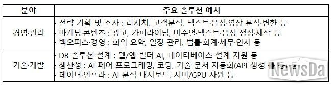 국내 유망 AI 벤처·스타트업을 대상으로 3월 9일부터 27일까지 AI 솔루션을 공모하여 총 370개를 접수했고, 접수된 370개 중 전략 기획, 마케팅·경영 등 ‘경영·관리 분야’에 270여개, 데이터·인프라, 프로그래밍 등 ‘기술·개발’ 분야에 100여개가 모집됐다.