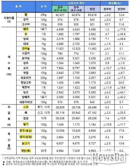 점검 결과, 농산물은 대다수 품목이 전년 대비 낮은 수준이다. 특히, 양파, 양배추, 당근 등 노지채소류는 가격이 큰 폭으로 하락함에 따라 시장격리, 정부 비축물량 출하정지와 함께 소비촉진을 추진하고 있다.