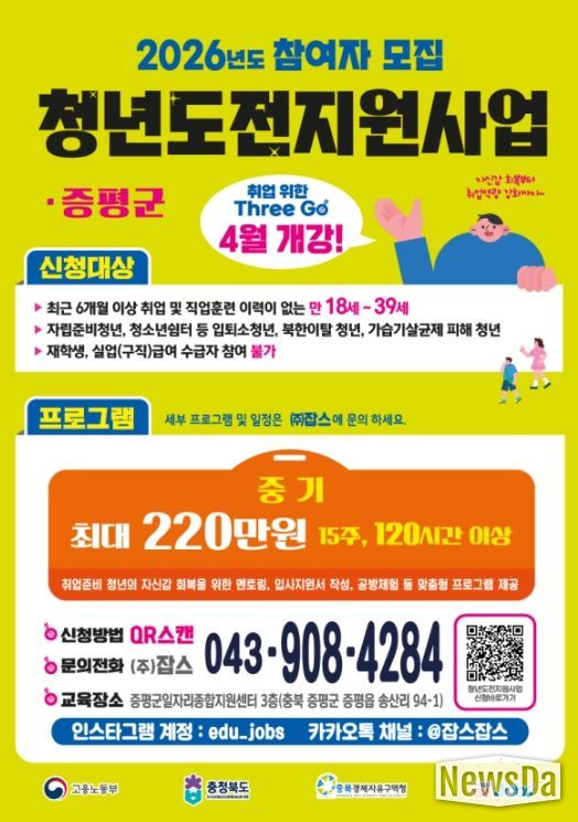 신청은 홍보물에 안내된 QR코드를 통해 가능하며, 세부 일정과 프로그램 관련 문의는 수행기관인 ㈜잡스로 하면 된다.