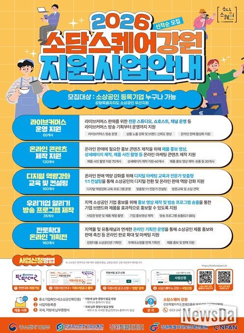 뉴스다 최광묵 기자 | 디지털커머스 전문기관 ‘소담스퀘어 강원’이 도내 소상공인의 성공적인 온라인 시장 진출과 디지털 전환을 돕기 위해 ‘2026년도 지원사업’ 참여 업체를 지난 13일부터 연중 상시 모집 중이라고 밝혔다.