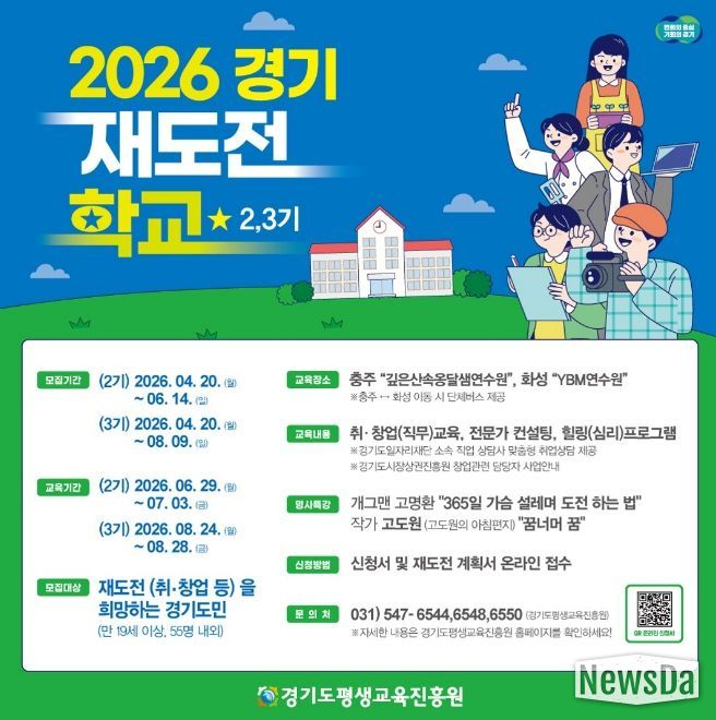 뉴스다 최광묵 기자 | 경기도와 경기도평생교육진흥원은 취업이나 창업 실패를 경험한 도민의 재기를 지원하기 위해 오는 20일부터 ‘2026년 경기 재도전학교’ 2~3기 참가자를 각각 55명 내외로 모집한다.