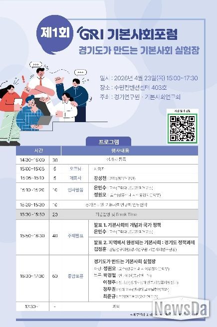 뉴스다 최광묵 기자 | 경기연구원은 오는 23일 오후 3시 수원컨벤션센터 403호에서 ‘경기도가 만드는 기본사회 실험장’을 주제로 ‘제1회 GRI 기본사회포럼’을 개최한다.