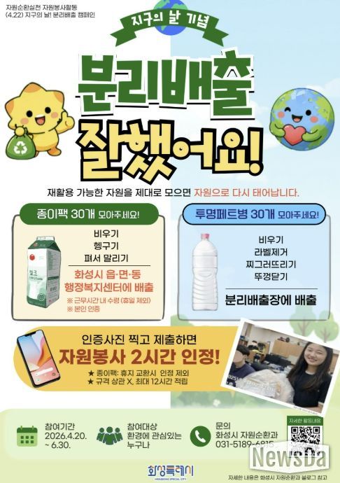 뉴스다 최광묵 기자 | 화성특례시가 2026년 ‘지구의 날(4월 22일)’을 맞아 시민들이 일상 속에서 환경 보호를 실천할 수 있는 자원봉사 활동 '분리배출 잘했어요' 캠페인을 운영한다고 밝혔다.