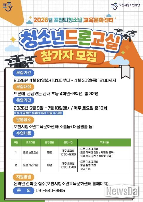 뉴스다 최광묵 기자 | (재)포천시청소년재단 포천시청소년교육문화센터는 오는 4월 21일부터 30일까지 관내 초등학교 4학년부터 6학년을 대상으로 청소년드론교실 1기 참가자를 선착순으로 모집한다고 밝혔다.