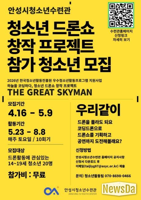 뉴스다 최광묵 기자 | 안성시청소년수련관은 미래 디지털 인재 양성을 위한 청소년 참여형 프로그램 '하늘을 코딩하다, 청소년 드론쇼 창작 프로젝트 ‘THE GREAT SKYMAN’'에 참여할 청소년을 4월 16일 ~ 5월 8일까지 모집한다고 밝혔다.