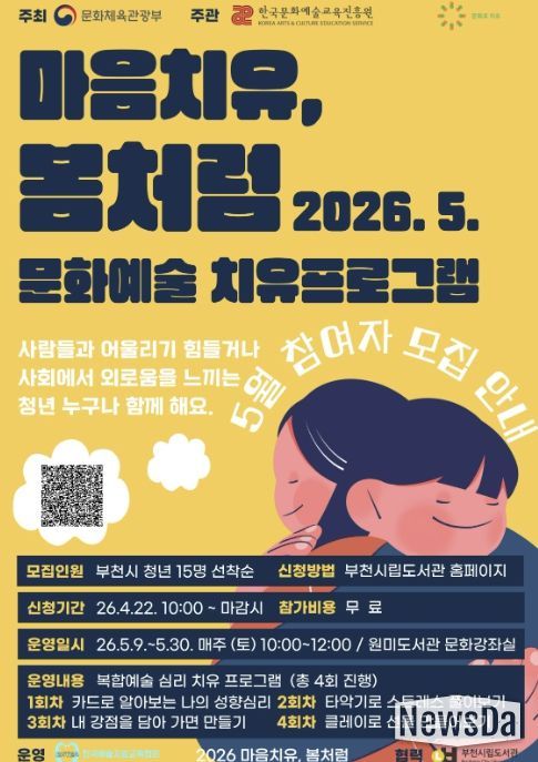 뉴스다 최광묵 기자 | 부천시립원미도서관 청년공간 ‘원미청정구역’이 문화체육관광부 주최하고 한국문화예술교육진흥원이 주관하는 ‘2026 마음치유, 봄처럼’ 사업 협력기관으로 선정돼 청년 대상 문화예술 치유 프로그램을 운영한다고 21일 밝혔다.