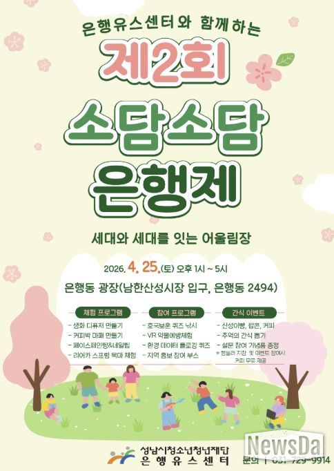 뉴스다 최광묵 기자 | 성남시청소년청년재단 은행유스센터는 오는 4월 25일 오후 1시부터 5시까지 은행동 광장에서 청소년과 지역 주민이 함께하는 ‘제2회 소담소담 은행제’를 개최한다.