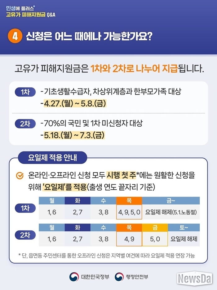 · 온라인·오프라인 신청 모두 시행 첫 주*에는 원활한 신청을 위해 '요일제'를 적용(출생 연도 끝자리 기준)
