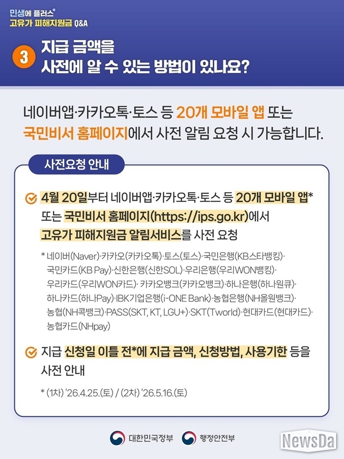 · 4월 20일부터 네이버앱·카카오톡·토스 등 20개 모바일 앱* 또는 국민비서 홈페이지에서 고유가 피해지원금 알림서비스를 사전 요청