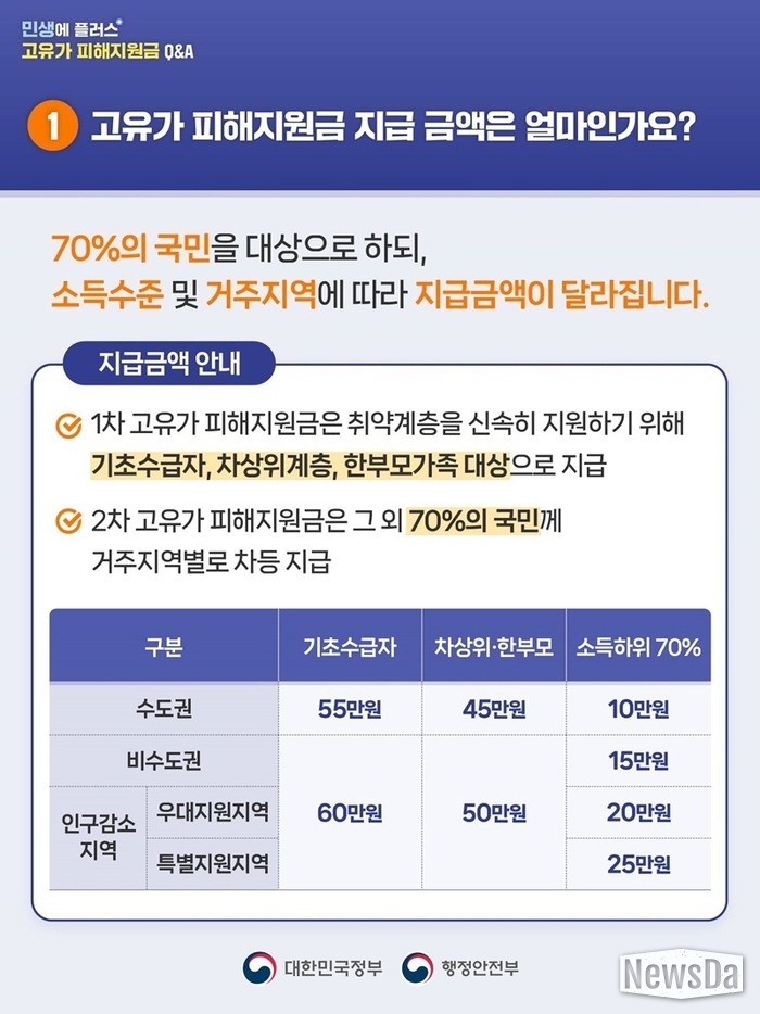 70%의 국민을 대상으로 하되, 소득수준 및 거주지역에 따라 지급금액이 달라집니다.