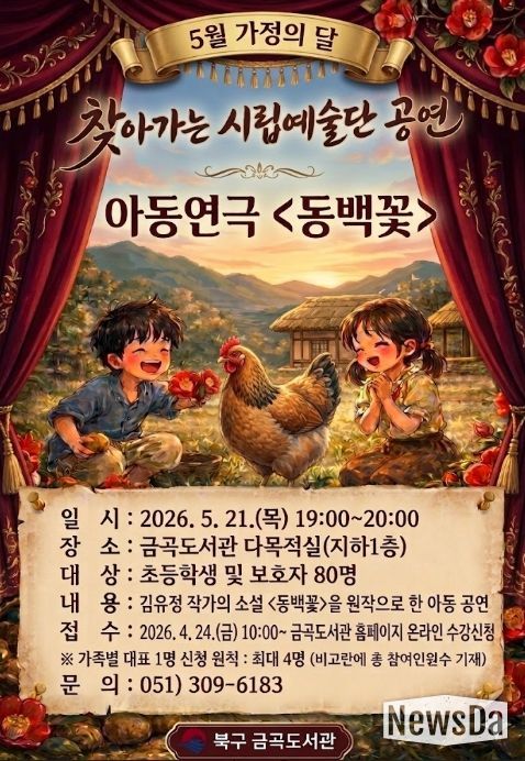 뉴스다 최광묵 기자 | 부산 북구는 오는 5월 21일 저녁 7시, 5월 가정의 달을 맞아 금곡도서관에서 지역 주민을 대상으로 김유정 작가의 단편소설 ‘동백꽃’을 원작으로 한 아동연극 공연을 개최한다고 밝혔다.