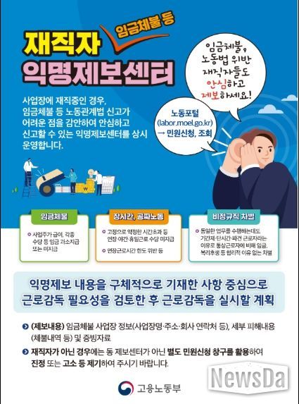 뉴스다 최광묵 기자 | 고용노동부는 ‘숨어있는 체불’을 선제적으로 청산하고 포괄임금 오남용으로 인한 “공짜 노동”을 근절하기 위해 「재직자 익명제보 사업장 근로감독」을 4월 22일부터 약 2개월간 진행한다고 밝혔다.