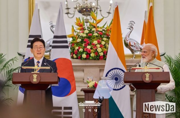 뉴스다 최광묵 기자 | 인도를 국빈 방문 중인 이재명 대통령은 20일(현지시간) 나렌드라 모디 총리와 정상회담을 갖고 "기존 경제 협력을 더욱 고도화하는 한편, 조선, 금융, 인공지능(AI), 국방·방산을 비롯한 전략 산업 분야에서의 협력을 확대하고, 문화와 인적 교류도 한층 강화해 나가기로 했다"고 말했다.