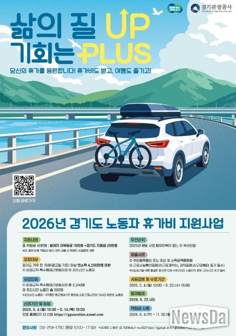 뉴스다 최광묵 기자 | 경기도가 경제적 부담으로 휴식을 포기했던 비정규직과 특수형태근로종사자에게 휴가비를 지원하는 ‘취약노동자 휴가비 지원사업’ 참여자를 5월 4일부터 14일까지 모집한다.