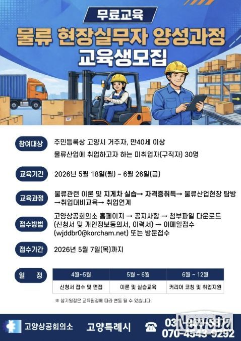 뉴스다 최광묵 기자 | 고양특례시는 2026년 고양맞춤형 일자리학교 공모에 선정된 ‘물류 현장실무자 양성과정’에 참여할 교육생을 오는 5월 7일까지 모집한다.
