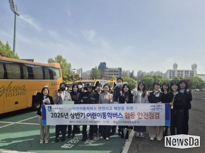 뉴스다 최광묵 기자 | 수원특례시는 21일 수원종합운동장 주차구역에서 수원 장안·권선·팔달·영통경찰서, 한국교통안전공단과 함께 ‘2026년 상반기 어린이통학버스 합동 안전점검’을 했다.