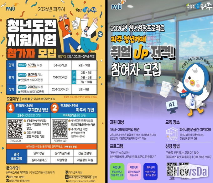 뉴스다 최광묵 기자 | 파주시는 최근 중동 지역 정세 불안에 따른 국내 경제 여건 악화와 고용시장 위축에 선제적으로 대응하기 위해 국비 연계(매칭) 사업비 증액을 요청해 청년 취업 지원사업 참여 인원을 확대한다. 이는 파주시 비상경제본부의 복지안정대응 분야 대책으로 이를 통해 청년 고용 여건 악화에 적기 대응하고자 한다.