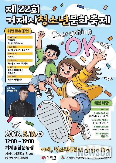 뉴스다 최광묵 기자 | 거제시는 오는 2026년 5월 16일 12:00~19:00, 거제종합운동장(우천 시 거제시체육관)에서 제22회 거제시청소년문화축제 “Everything OK”를 개최한다.