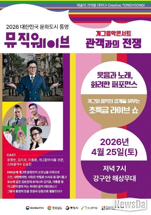 뉴스다 최광묵 기자 | (재)통영문화재단은 오는 25일 오후 7시 강구안 해상무대에서 2026년 뮤직웨이브 정기공연으로 음악과 개그의 경계를 허무는 특급 라이브쇼 개그음악콘서트 ‘관객과의 전쟁’공연을 진행한다.