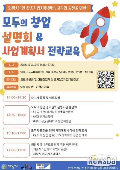 뉴스다 최광묵 기자 | 의왕시 1인 창조기업지원센터는 4월 30일, 창업을 희망하는 예비 및 초기 창업자를 대상으로 ‘모두의 창업’ 설명회 및 전략 교육을 개최한다.