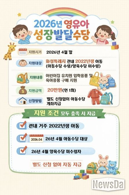 뉴스다 최광묵 기자 | 화성특례시는 어린이집 및 유치원 입학 초기 영유아 가정의 양육 부담을 덜고 아동의 건강한 성장을 지원하기 위해 ‘2026년 영유아 성장발달수당’을 지급한다고 밝혔다.