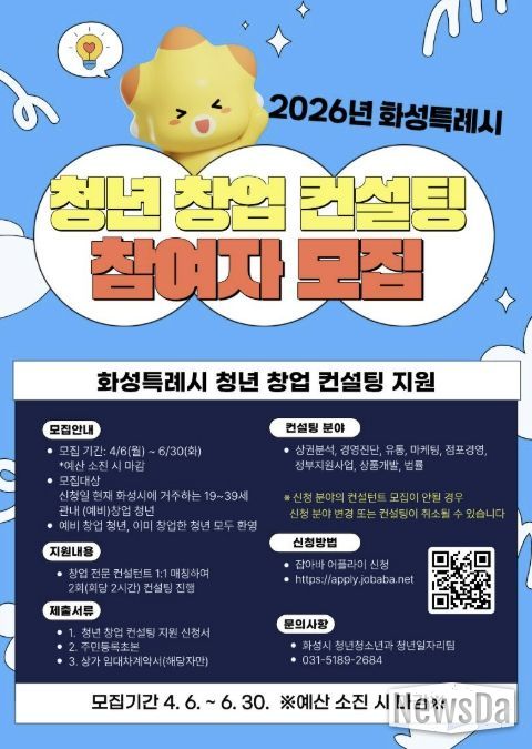 뉴스다 최광묵 기자 | 화성특례시는 오는 6월 30일까지 ‘2026년 청년 창업 컨설팅 지원사업’ 참여자를 모집한다.