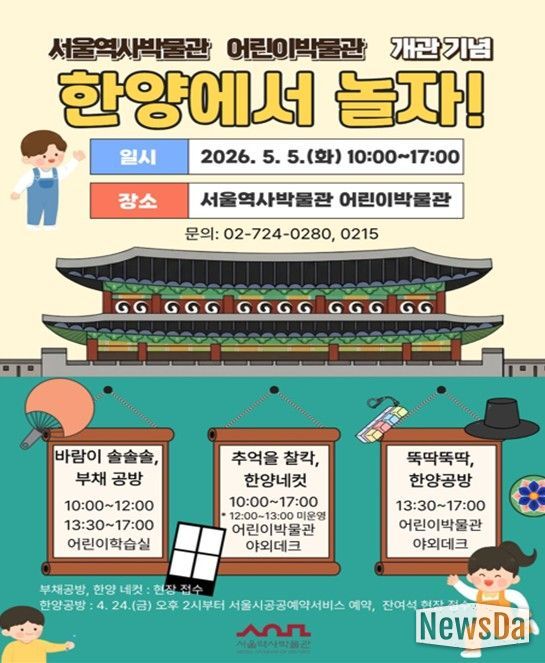 뉴스다 최광묵 기자 | 서울역사박물관은 어린이박물관 개관 후 첫 어린이날을 맞아 박물관과 경희궁 일대에서 온 가족이 함께 즐길 수 있는 다채로운 문화 행사와 전시를 선보인다.