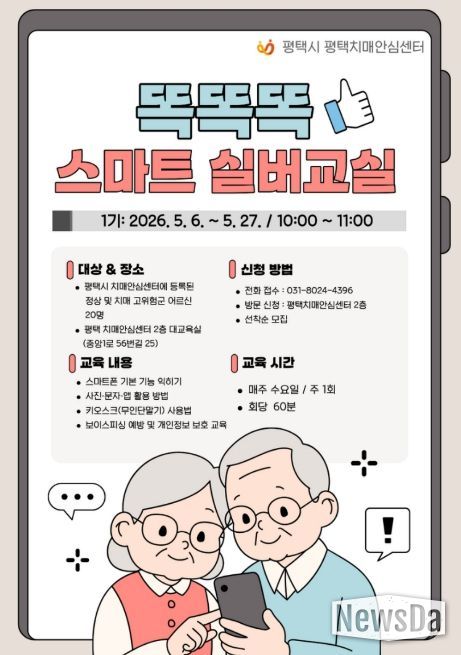 뉴스다 최광묵 기자 | 평택치매안심센터는 오는 5월 6일부터 27일까지 치매 예방 및 인지 기능 강화를 위한 ‘똑똑똑 스마트 실버교실’을 운영한다고 밝혔다.