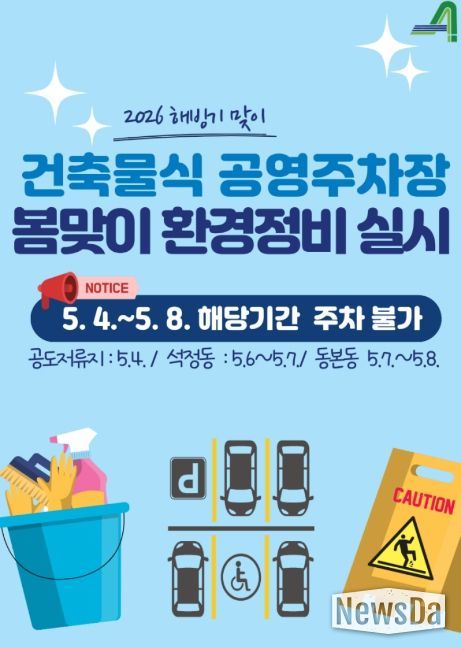 뉴스다 최광묵 기자 | 안성시시설관리공단은 해빙기를 맞아 공영주차장 이용객들에게 더욱 쾌적하고 안전한 주차 환경을 제공하기 위해 오는 5월 4일부터 8일까지 관내 건축물식 공영주차장 3개소를 대상으로 환경정비를 실시한다고 밝혔다.