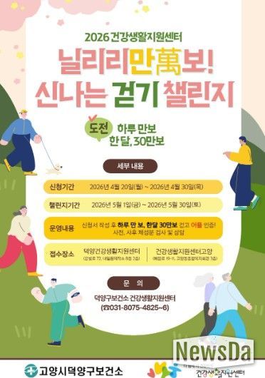 뉴스다 최광묵 기자 | 고양특례시 덕양구보건소 건강생활지원센터는 지역주민의 건강생활 실천 확산을 위한 생활밀착형 걷기 프로그램 ‘2026 닐리리만보 걷기 챌린지’를 오는 5월부터 운영을 시작한다.