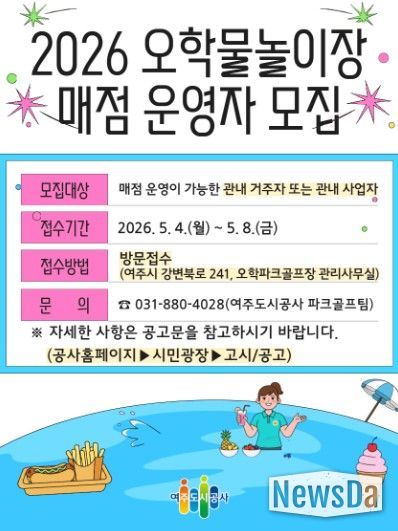 뉴스다 최광묵 기자 | 여주도시공사는 2026년 오학물놀이장 운영을 앞두고 이용객 편의 제공을 위한 매점 운영자를 공개 모집한다고 밝혔다.