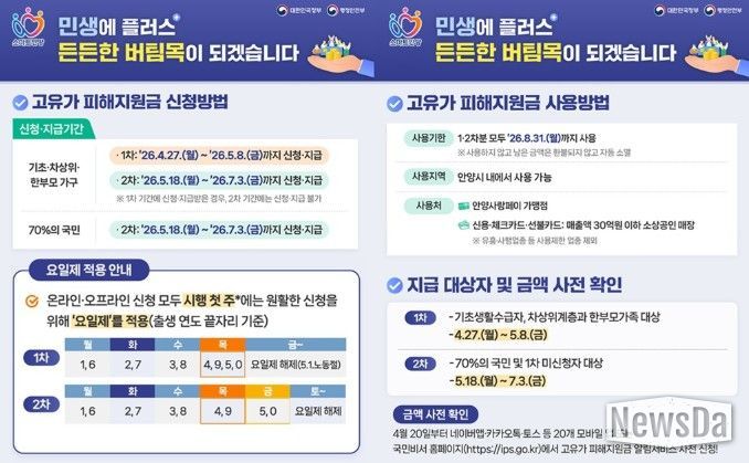 1차 신청 둘째 주(5월 4~8일)에는 출생연도에 관계없이 대상자는 모두 신청할 수 있으며, 주말에는 온라인 신청(카드사 홈페이지·앱·콜센터·ARS, 토스·케이뱅크·카카오뱅크·카카오페이·네이버페이 앱 등)만 가능하다.