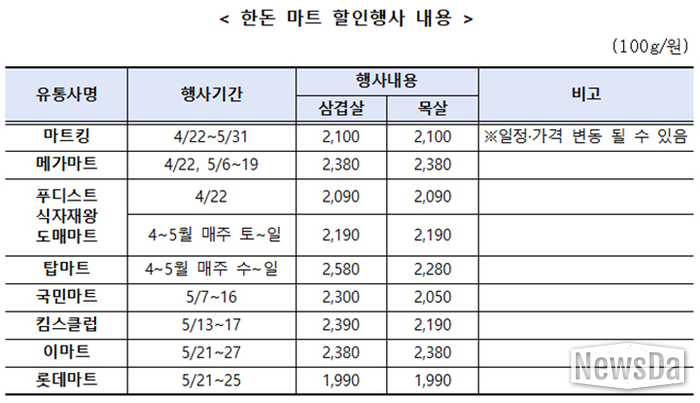 먼저 오프라인에서는 이마트, 롯데마트, 킴스클럽 등 전국 8개 대형마트에서 이달 22일부터 5월 31일까지 삼겹살과 목살을 30% 이상 할인 판매한다.